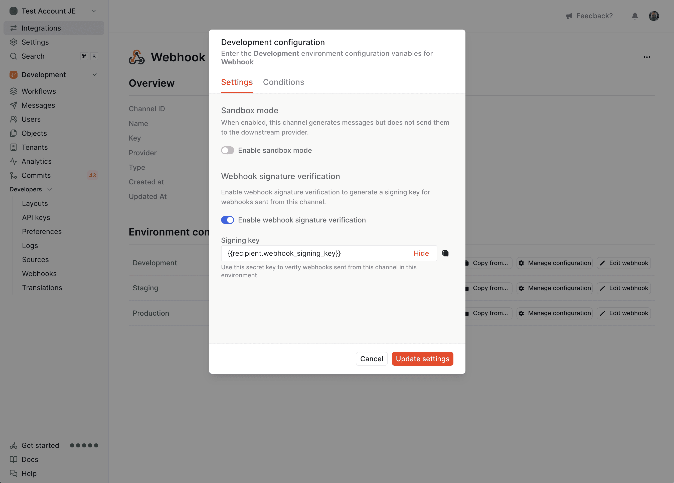 Once your webhook channel has been created, you'll be able to manage its configuration on a per-environment basis. As with all Knock channels, webhooks can be used in sandbox mode and can be used with channel conditions.
